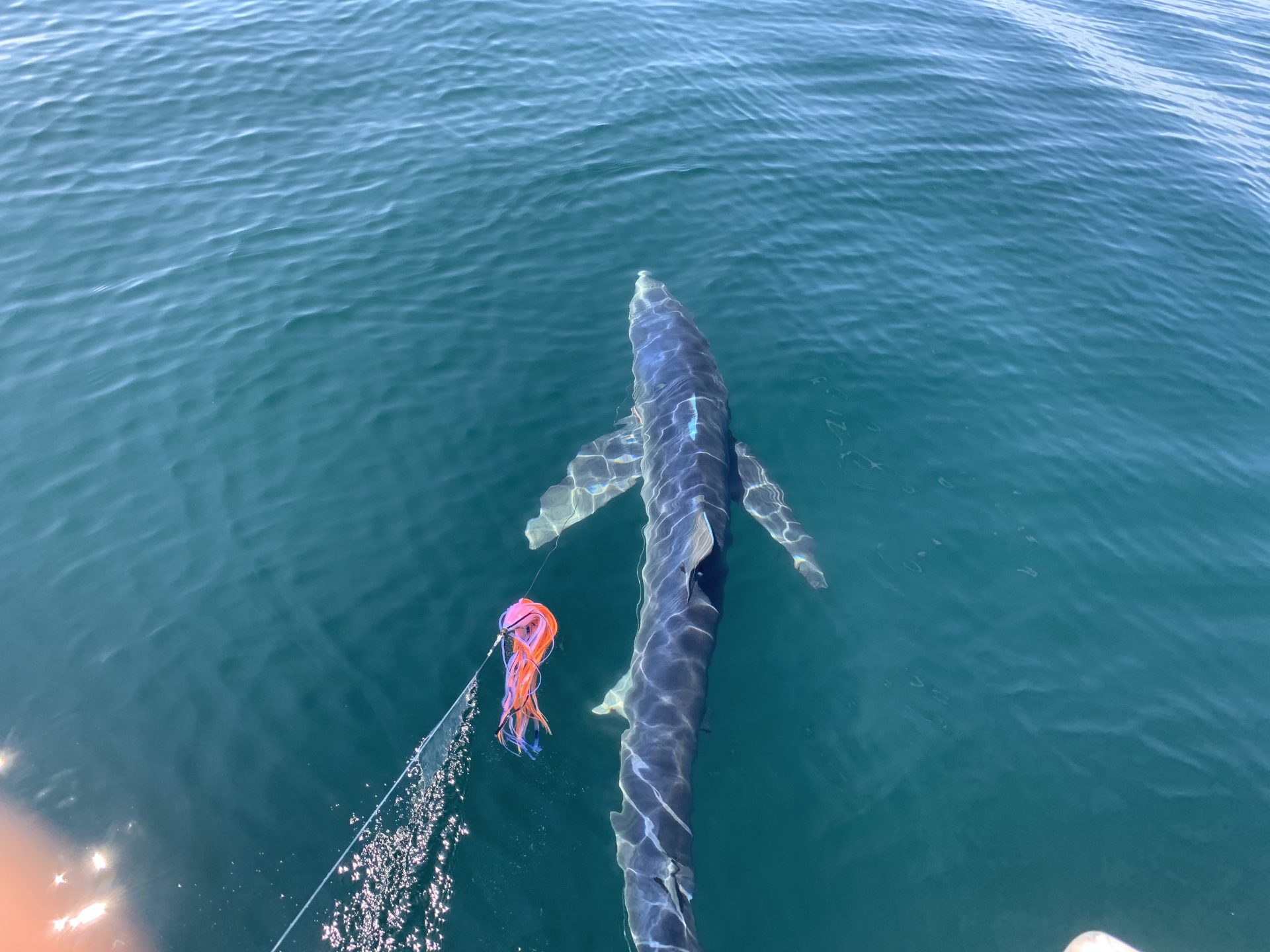 Our shark trips depart at either 5am, 6 am. We will travel to shark-infested waters off Cape Cod, procure bait along the voyage and then proceed to create a slick to draw them in! Once a chum slick is going, we drift live and artificial baits. It won’t take long for fins to be circling the boat. We use conventional setups as well as spinning gear to bring these toothy monsters to the boat. The areas we Shark fish can provide quite the whale watch as well!